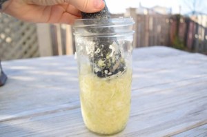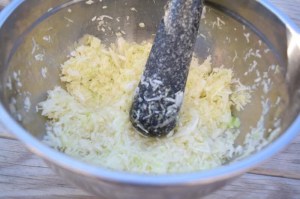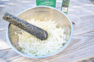 Throw your shredded cabbage into a bowl and mix in the salt. What you will be doing next is trying to bring the moisture out of the cabbage to make a brine. This can be done by massaging, squeezing, and mashing the cabbage until you get a good puddle of brine. This will take about 3-8 minutes. I have a nice heavy mortar and pestle (awesome b-day gift from my mom!) that works well… even if I am using a bigger bowl than the mortar, the pestle is very helpful. If you have more time, you can let the salt sit on the cabbage for 20 mins or so. This will cause the cabbage to begin sweating, at which point it will take much less time to work out more brine.